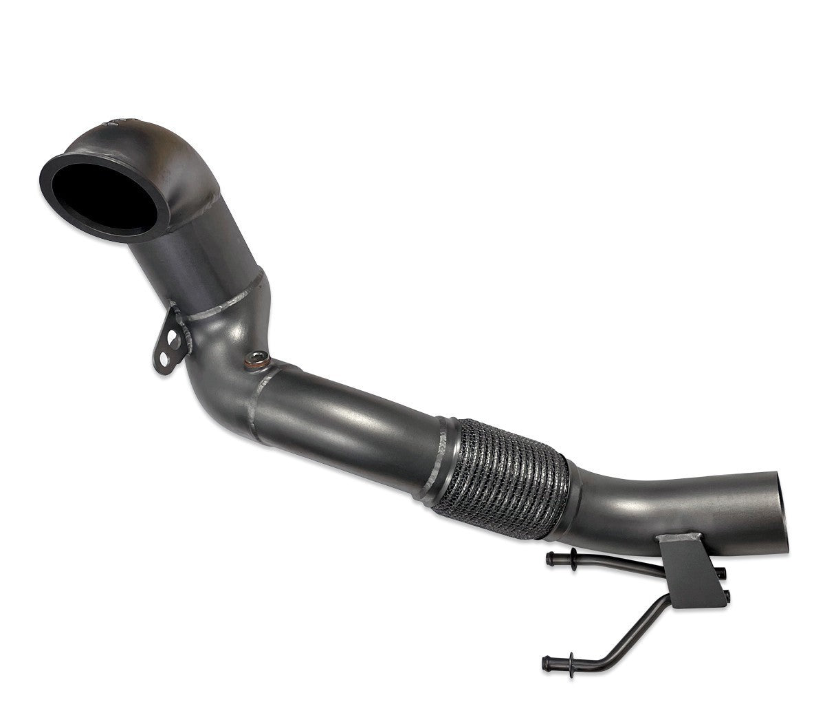 Optimized for increased flow and maximum performance, the MQB 1.8T/2.0T Cast Stainless Steel Racing Downpipe features organic geometry and a massive 101.6mm diameter Euro 3 racing catalytic converter in the factory location. This complete downpipe solution includes an integrated v-band flange at the turbine outlet, integrated oxygen sensor bung after the catalyst, OEM-style corrugated flex bellow, and factory-location exhaust hanger. The MQB 1.8T/2.0T Cast Stainless Steel Racing Downpipe is constructed from 304 stainless steel and TIG-welded for maximum durability and corrosion resistance.
